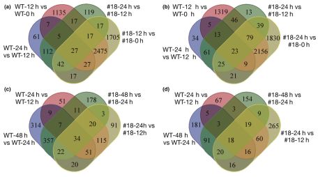 使用Illumina測序技術(shù)進行轉(zhuǎn)錄組分析從而鑒定影響不定根生成的差異表達基因。不論在野生型還是過表達植株里,0h與12h的差異表達基因均多于12h vs. 24h和24h vs. 48h比較組。因此,在不定根誘導(dǎo)和萌發(fā)的前12h發(fā)生了大量基因的重塑。OE植株在前12h增加1518個差異表達基因,其中有119個基因在野生型的12h vs. 24h中出現(xiàn)(圖3)。這些結(jié)果表明,PagFBL1基因的高表達會增強促進不定根形成的基因的表達變化。