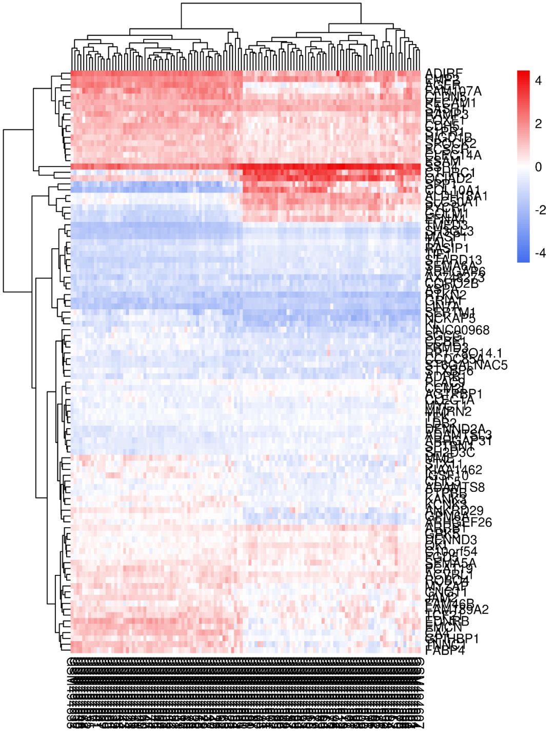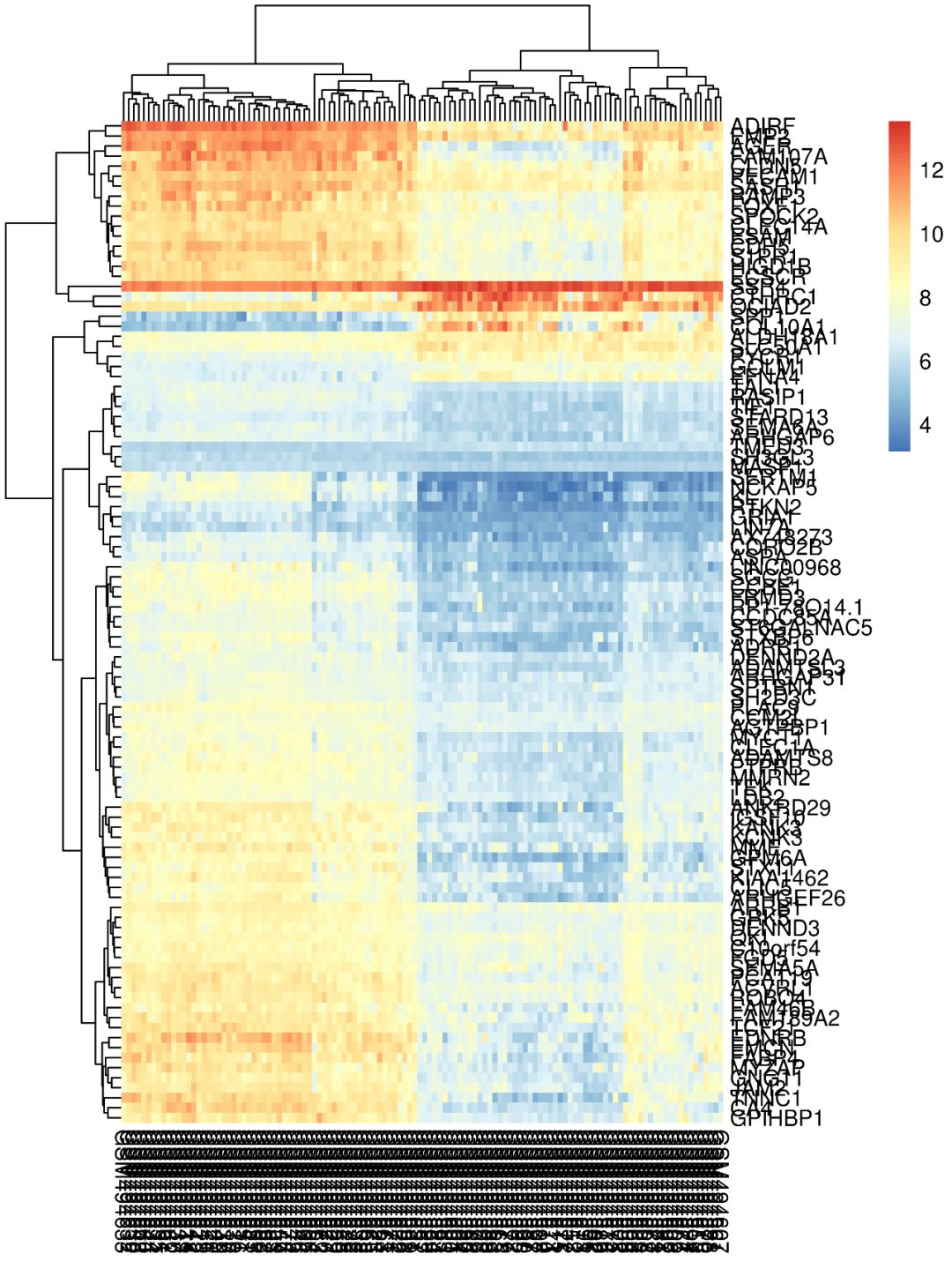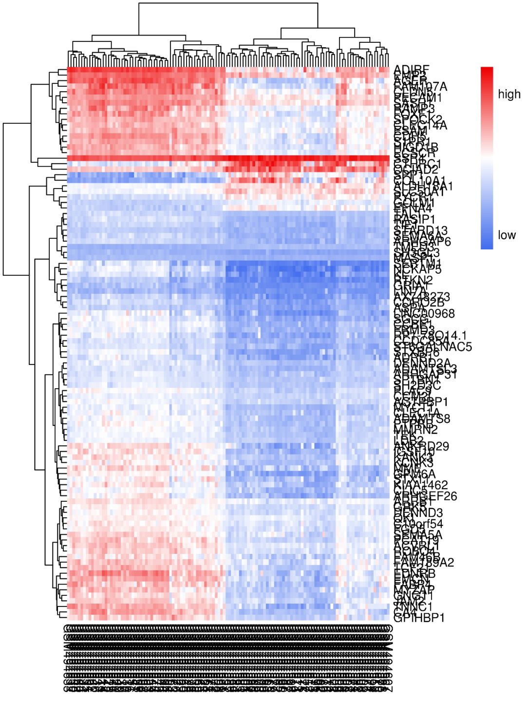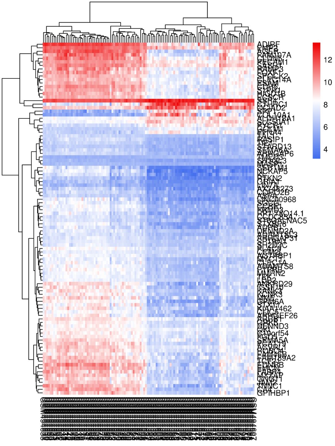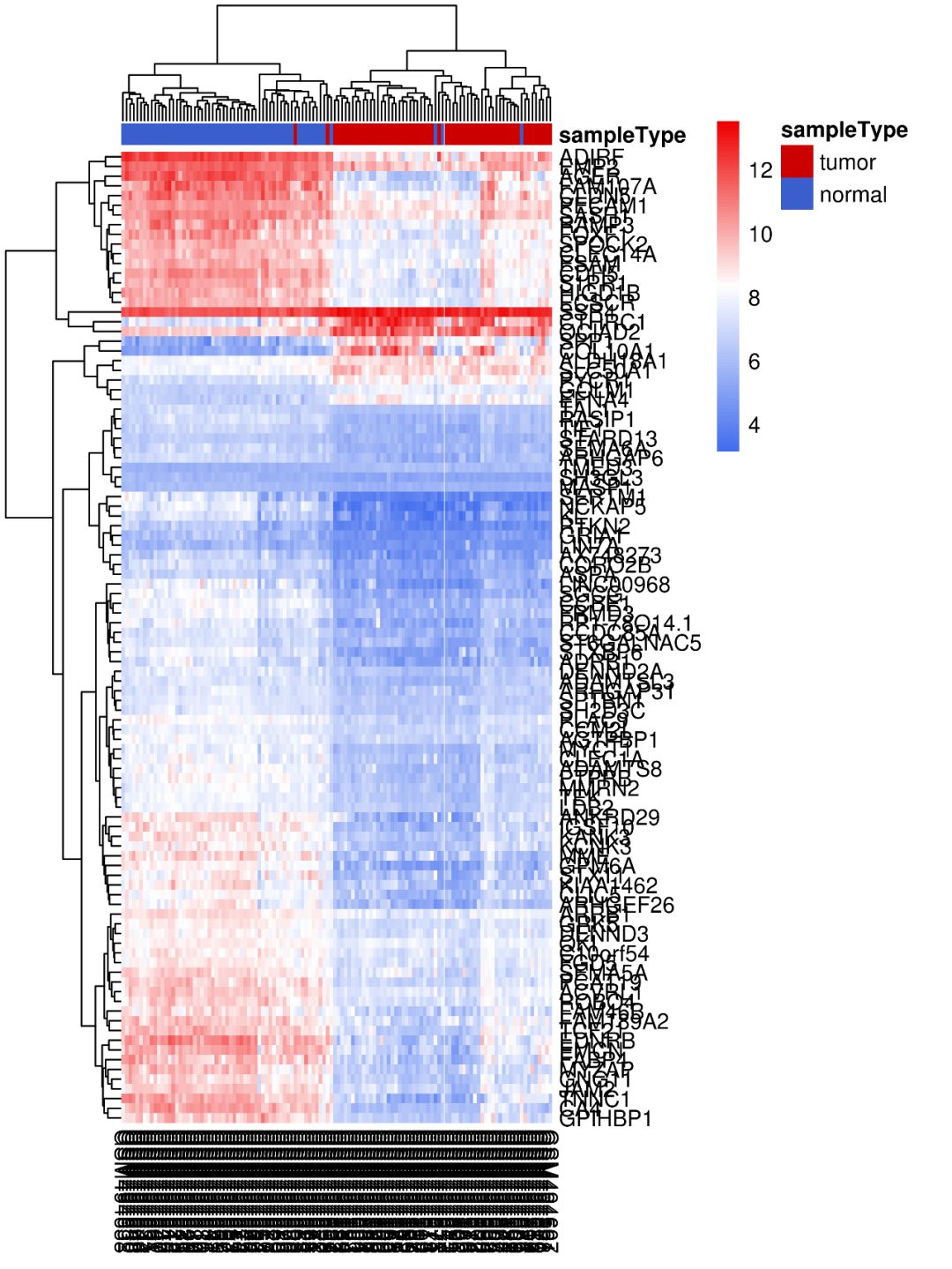 此次例子,我們選擇了一套GEO數據庫的肺癌數據,數據編號為GSE19804,120個樣本,其中包含60個癌癥樣本和60個癌旁正常樣本,前面我們使用t檢驗,并對p值進行BH校正,篩選fdr小于0.01的基因中前100個在癌癥相對于正常樣本中顯著差異表達的基因進行熱圖繪制。
