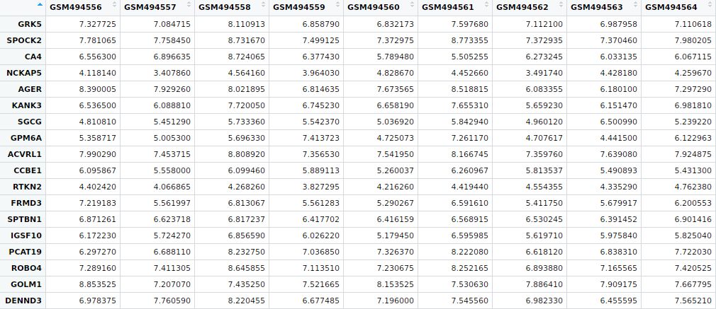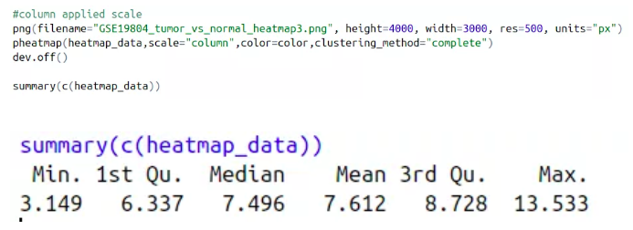 我們現在將數據進行行均一化,聚類方法選擇complete,進行均一化之后的熱圖還沒有前面的好看,查看數據表達情況,我們發(fā)現最小的表達值3.149和最大的表達值13.533之間并沒有相差很大,因此這套數據其實不適合做均一化處理,畫出來的熱圖更好看。