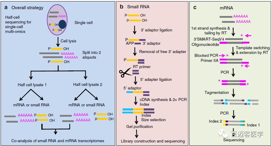 a 基于半細(xì)胞的單細(xì)胞miRNA-mRNA共測序的實(shí)驗(yàn)流程; b 單獨(dú)的scmiRNA-seq流程;c 單獨(dú)的scRNA-seq流程