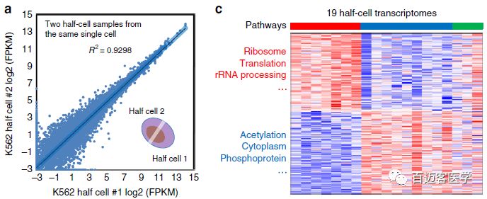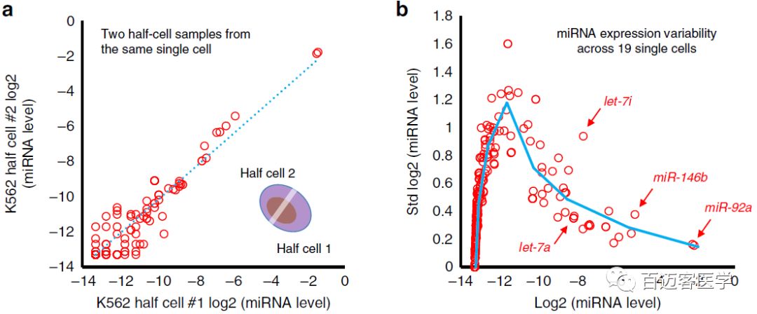 1、作者首先分別比較了來自同一細(xì)胞的半細(xì)胞單細(xì)胞microRNA測序和單細(xì)胞轉(zhuǎn)錄組測序之間的差異:該方法表現(xiàn)出良好的穩(wěn)健性(~95%成功率)和重現(xiàn)性(microRNA和mRNA的R2=0.93),產(chǎn)生可獨(dú)立驗(yàn)證的成對半細(xì)胞microRNA和mRNA表達(dá)譜。