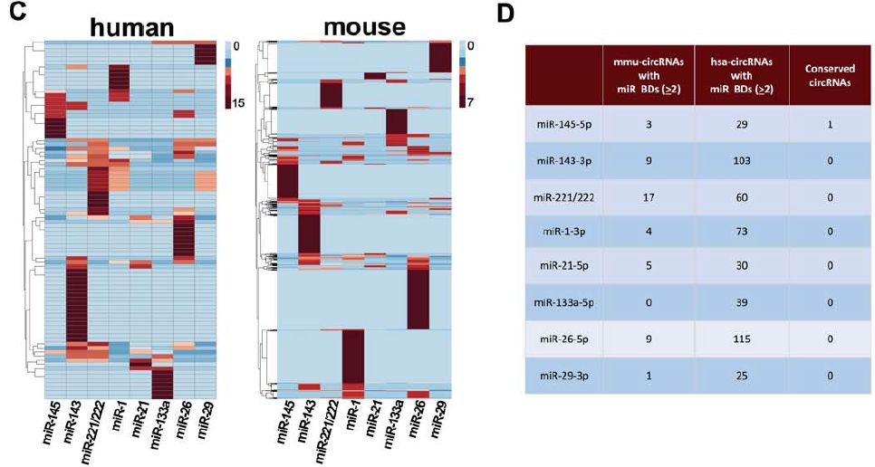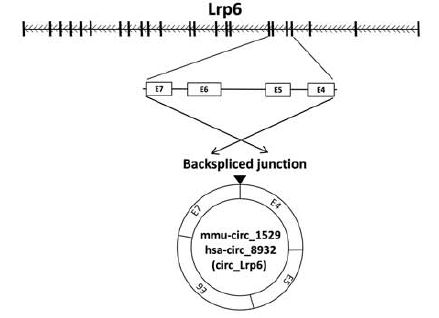 對于之前在VSMC具有重要生物學作用的miRNA,至少包含其中2個miRNA的保守結(jié)合位點:只有一個circRNA具有miR-145-5p結(jié)合位點,在小鼠和人之間是保守的。(小鼠中已被命名為circ_1529,人類中命名為circ_8932,其來源基因為Lrp6,其至少具有7個miR-145-5p結(jié)合位點)