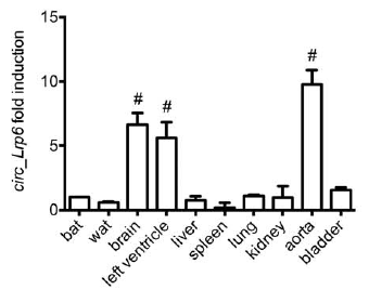 divergent primer擴增cDNA和gDNA,驗證其來源于可變剪接;RNAse R抗性檢測;放線菌素D處理抑制轉(zhuǎn)錄證實circRNA的穩(wěn)定性(更長的turn-over時間);qRT-PCR檢測各組織中circ_Lrp6表達水平并結(jié)合RNA-seq數(shù)據(jù)進行分析:circ_Lrp6和Lrp6在血管中富集。
