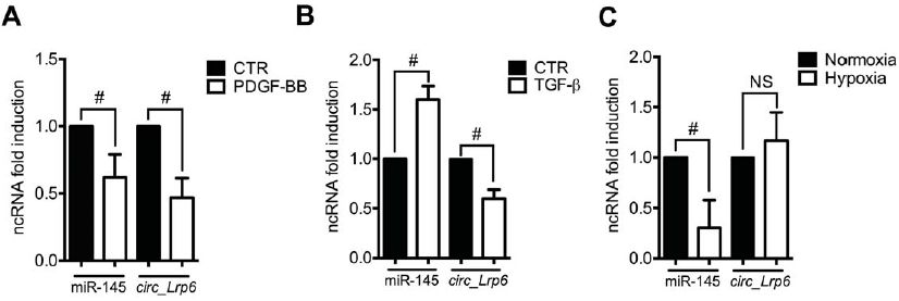 血小板衍生生長因子(PDGF-BB)和轉(zhuǎn)化生長因子(TGF-β)分別處理VSMC,在TGF-β處理的細胞中circ_Lrp6和miR-145表達之間存在負相關(guān)。