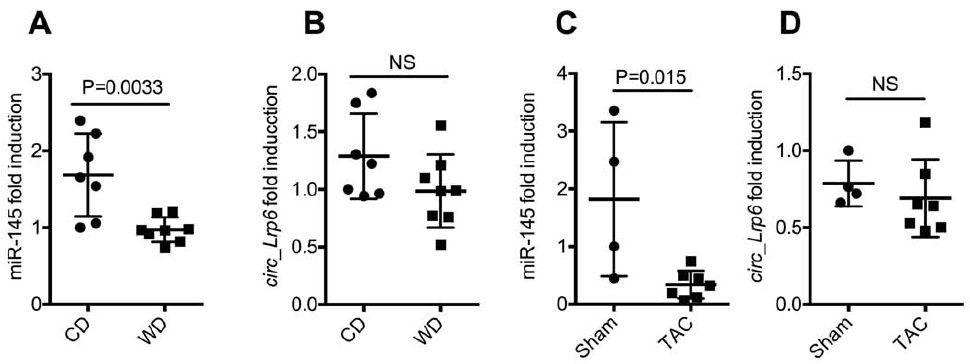 不同病理狀況circ_Lrp6和miR-145表達分析:例如動脈粥樣硬化血管患者中,miR-145的表達顯著降低,但circ_Lrp6沒有顯著變化,在復雜的病理學中兩個ncRNA在基因表達方面解離。