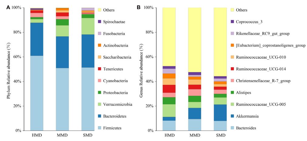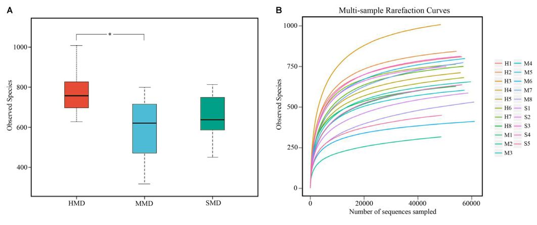 1、結(jié)果16S-rRNA基因測序結(jié)果分析從8個HMD,8個MMD和5個SMD糞便樣品中獲得總共1,165,731個高質(zhì)量序列,并且從每個樣品獲得48,489-61,048個分析序列(平均長度= 406.3bp)。HMD,MMD和SMD中觀察到的物種(OTU)顯示在圖1A中,每個樣品的平均OTU數(shù)為675±160。本研究中檢測到的數(shù)量表明物種的數(shù)量隨著測序深度的增加而增加。稀釋曲線的末端隨著每個樣品的序列數(shù)量的增加而逐漸減少(圖1B)。得到的OTU在Silva數(shù)據(jù)庫中進行比對注釋,最后得到的細菌主要分為16門,26類,43目,63科和160屬。結(jié)果表明,健康麝的腸道微生物具有較高的細菌多樣性,而腹瀉麝的細菌多樣性較低。因此,腸道微生物中細菌物種的豐富性和多樣性是“健康”的重要組成部分,它們在維持腸道微生態(tài)系統(tǒng)的動態(tài)平衡和確保正常生理功能方面有重要作用。