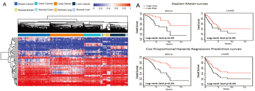 從TCGA中常見(jiàn)癌癥(肺癌、乳腺癌、結(jié)腸癌、肝癌)的甲基化數(shù)據(jù)中篩選癌癥標(biāo)記物,這些標(biāo)記物能非常準(zhǔn)確的(準(zhǔn)確度95%)區(qū)分開(kāi)癌組織和正常組織。同時(shí)他們發(fā)現(xiàn)DNA甲基化模式可以預(yù)測(cè)預(yù)后和生存。