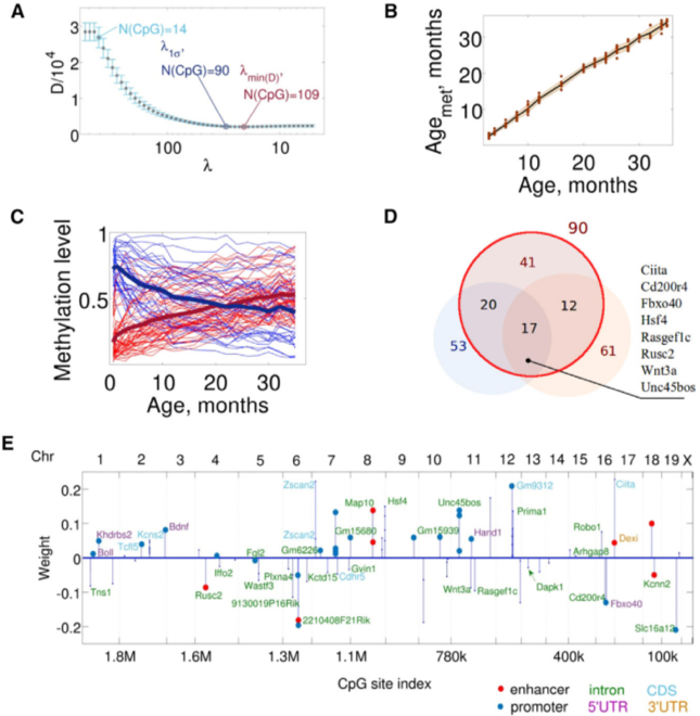 該研究對(duì)不同年齡階段的小鼠進(jìn)行RRBS研究,并找到了90個(gè)與年齡相關(guān)的CpG位點(diǎn)來(lái)構(gòu)建小鼠生物學(xué)年齡的預(yù)測(cè)器。這些位點(diǎn)的clock代表了衰老的生物標(biāo)志物,并可以用來(lái)確定生物體的生物學(xué)年齡,并進(jìn)一步干預(yù)衰老的速度。