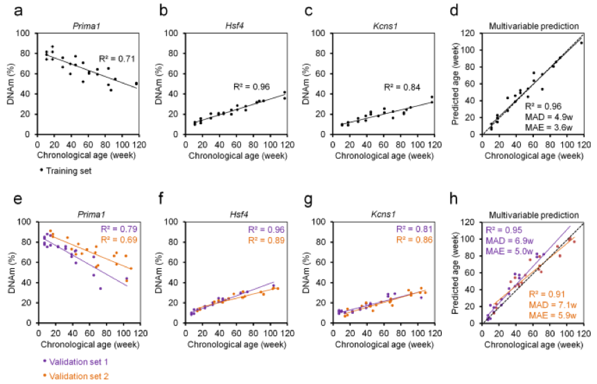 該研究從上述研究及其他研究中的基礎(chǔ)上選擇了9個(gè)甲基化區(qū)域在不同年齡段的小鼠血液樣品中進(jìn)行焦磷酸測(cè)序,建立年齡預(yù)測(cè)的模型,最后選擇了3個(gè)CpG位點(diǎn)(Prima 1, Hsf4, Kcns 1)來(lái)預(yù)測(cè)小鼠的年齡和壽命。