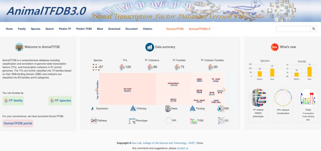 顯而易見,這兩個(gè)數(shù)據(jù)庫分別收錄了動(dòng)物和植物的TF,包含轉(zhuǎn)錄因子注釋和預(yù)測(cè)等。這里小編著重說一下AnimalTFDB。AnimalTFDB 3.0數(shù)據(jù)庫去年9月份更新,是華中科技大學(xué)郭安源教授團(tuán)隊(duì)建立并維護(hù)的。