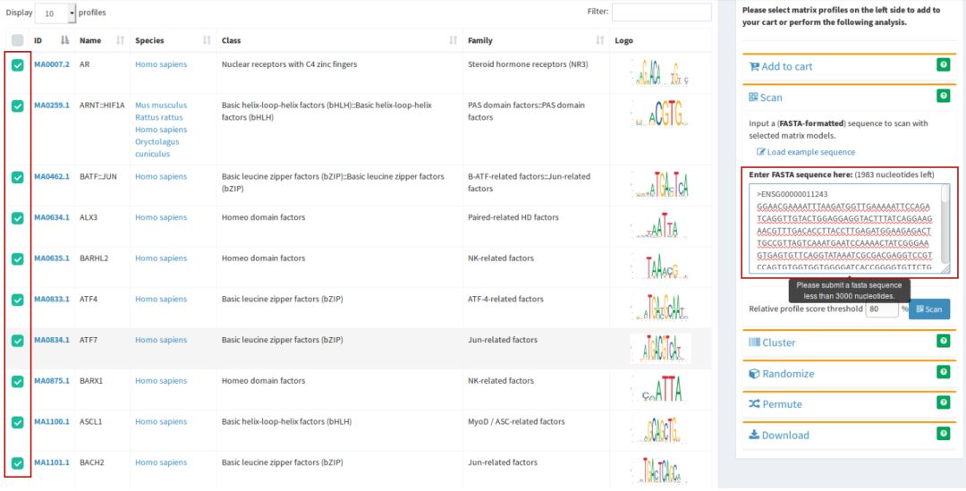 (2)在Scan序列輸入框里輸入我們想要查找的啟動(dòng)子區(qū)域序列或增強(qiáng)子區(qū)域序列或其它關(guān)注的區(qū)域,注意需要輸入FASTA格式。在左側(cè)列表中勾選待預(yù)測(cè)結(jié)合的轉(zhuǎn)錄因子,或者你感興趣的轉(zhuǎn)錄因子都勾選上。