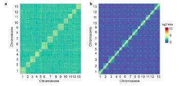注:a. Hi-C數(shù)據(jù)與亞洲棉原基因組比對;b. Hi-C數(shù)據(jù)與亞洲棉更新基因組比對