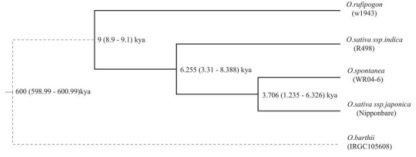 利用OrthoMCL軟件檢測WR04-6、R498、Nipponbare和W1943(O. rufipogon)間核心的、非必須的和共有的基因家族。在WR04-6中鑒定到了909個擴(kuò)張的基因家族,并且通過通路分析顯示,這些基因在光合作用和呼吸作用中顯著富集(p<0.01),例如氧化磷酸化、光合作用和核糖體的KEGG途徑,考慮其可以作為遺傳改良的信號。以O. barthii作為外群構(gòu)建的進(jìn)化樹顯示W(wǎng)R04-6與粳稻祖先的分化時間估計(jì)在3,706ya(1,235ya-6,326ya),見圖4。