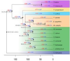 比較基因組分析:直系同源基因鑒定:?OrthoMCL (version 2.0);系統(tǒng)發(fā)育樹構(gòu)建與分化時間估算:?MUSCLE、Gblocks (version 0.91b)和RaxML(version 8),MCMCTREE評估分化時間;基因家族擴(kuò)張和收縮分析:CAFE(vertion 3.1);染色體共線性分析、4DTV檢測及Ks值計(jì)算:MCscan。