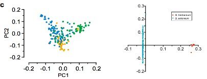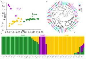 共計(jì)選擇了243份二倍體棉花材料:230份亞洲棉G. arboreum?(A2)?和13份草棉G. herbaceum?(A1),來自于中國南部(SC),長江(YZR)和黃河(YER)。以雷蒙德氏棉(G. raimondii)為外群,構(gòu)建系統(tǒng)發(fā)育樹顯示,G. herbaceum(草棉)和G. arboretum(亞洲棉)聚類成2個獨(dú)立的群(見圖2a和b)。G. arboretum(亞洲棉)進(jìn)一步又分為SC,YZR和YER三個群,顯示了地理分布模式的差異,進(jìn)而利用PCA分析支持這一結(jié)果(見圖2c)。