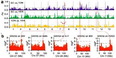 人工選擇在農(nóng)作物的馴化和遷徙的過程中具有重要的作用。群體結(jié)構(gòu)分析顯示當(dāng)K=4時,YER與SC和YZR明顯不同(圖2b,K=4)。通過兩兩群體間的選擇性清除分析(FST)鑒定出了分別覆蓋到59,53和51個顯著遺傳分化的區(qū)域。SC和YZR之間的21個分化的區(qū)域(約43.5 Mb?含有915個基因)在群體SC和YER之間是保守的(圖3a)。對來自不同環(huán)境下的11個重要性狀進(jìn)行全基因組關(guān)聯(lián)分析,在98個顯著關(guān)聯(lián)的信號中,其中25信號個來自基因區(qū)(外顯子或內(nèi)含子區(qū)),包含與形態(tài)性狀相關(guān)的8個信號區(qū),與產(chǎn)量性狀相關(guān)的6個信號區(qū),與油籽性狀相關(guān)的3個信號區(qū);剩余73個信號來自非編碼區(qū)。大部分農(nóng)藝性狀的GWAS關(guān)聯(lián)信號中顯示地理差異,如分支數(shù),開花期,鈴重和抗病性這些性狀定位在保守的基因區(qū)(圖4b)。