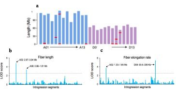 由陸地棉Emian22作為受體親本,海島棉3-79作為供體親本構(gòu)建包含168個個體的CSSLs群體,旨在引入有利的變異,如纖維質(zhì)量。QTL定位分析,共鑒定到5個性狀的13個QTLs位點(diǎn),其中控制纖維長度位點(diǎn)2個,控制纖維強(qiáng)度位點(diǎn)4個,馬克隆值位點(diǎn)2個,纖維伸長率位點(diǎn)2個,纖維均勻度位點(diǎn)3個(圖3)。在這些QTLs位點(diǎn)中,9個位點(diǎn)之前未被鑒定出,通過檢驗(yàn)13個QTLs中的基因表達(dá)水平,研究人員檢測到了235個在纖維發(fā)育過程中高度表達(dá)的基因,同時還整合了基因組變異數(shù)據(jù)來預(yù)測候選基因,而這些基因值得進(jìn)一步進(jìn)行精細(xì)定位以確認(rèn)對這些性狀具有重要影響的基因。