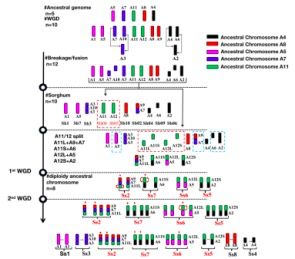 AP85-441基因組的組裝顯示了S. spontaneum的染色體數(shù)目從10降到8,而這與頻繁復(fù)制的古復(fù)制染色體對相關(guān),通過與高粱的聚類比對,發(fā)現(xiàn)高粱祖先5號染色體和8號染色體同源物經(jīng)歷了染色體裂變(見圖2)。SbChr05(A12)的祖先染色體斷裂分為兩個主要部分,即C5S(A12S)和C5L(A12L),分別轉(zhuǎn)移到SbChr06(A2)和SbChr07(A5)的祖先染色體;SbChr8(A11)的祖先染色體斷裂為兩個主要的部分,即C8S(A11S)和C8L(A11L),分別轉(zhuǎn)移到SbChr09(A6)和SbChr02(A7 + A9)的祖先染色體中。SbChr8和SsChr5之間及SbChr5和SsChr7之間近乎同源的短片段是在高粱與甘蔗分化前,高粱SSA形成于13.4 MYA同源基因的殘留物,同時發(fā)現(xiàn),S5中較小的SSA區(qū)域和S8中SSA的較大區(qū)域在重排的AP85-441基因組中也是保守的。