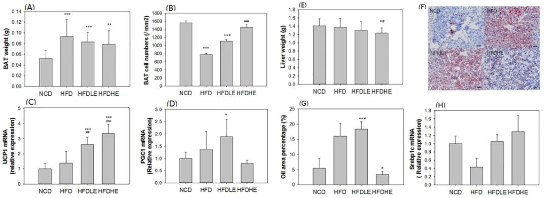 NLE未能顯著降低HFD導(dǎo)致的BAT增長(zhǎng)(圖2A),與脂肪代謝有關(guān)的UCP1和PGC1基因表達(dá)在HFD-LE組中顯著升高(圖2C-2D),HFD-HE顯著降低了肝重(圖2E),NLE對(duì)HFD誘導(dǎo)的脂肪增生具有有效的抑制作用(圖2F-2G)。Srebp1c與肝脂肪的變性有關(guān),NLE對(duì)HFD導(dǎo)致的Srebp1c基因表達(dá)水平降低有恢復(fù)作用(圖2H)。