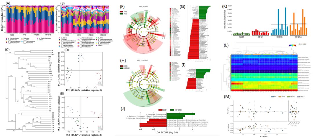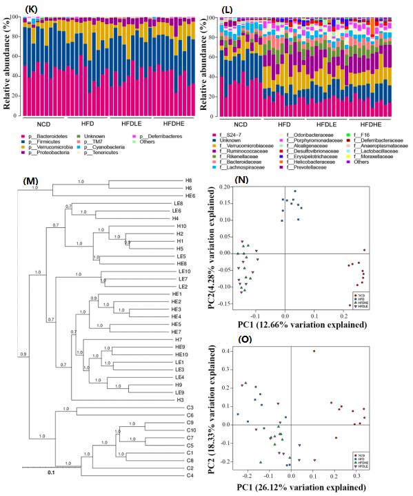 HFD導(dǎo)致小鼠腸道菌群的多樣性降低,然而NLE恢復(fù)了菌群多樣性(圖4)。Proteobacteria?、EpsilonproteobacteriaHelicobacteraceae?和Campylobacterales在HFD-HE組顯著富集(圖5H;5I),NCD與HFD-HE組的菌群結(jié)構(gòu)差異較?。▓D5J), NLE提高了HFD-HE和HFD-LE組Campylobacterales的豐度(圖5K)。NLE恢復(fù)了部分HFD導(dǎo)致的[K]轉(zhuǎn)錄和[G]碳水化合物代謝與運(yùn)輸?shù)墓δ茴愋停▓D5L)。