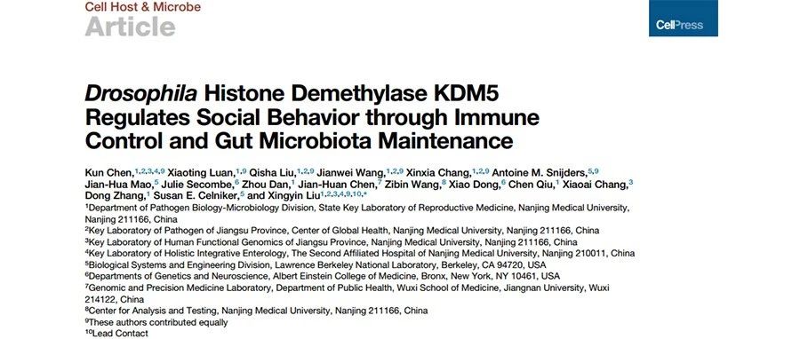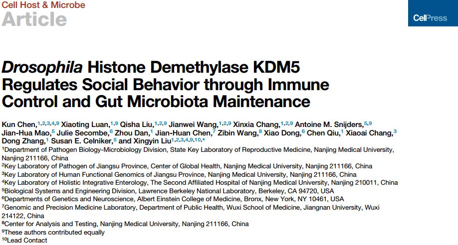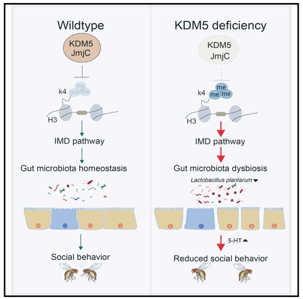 越來(lái)越多的研究表明,腸道菌群可以影響智力障礙(ID)和自閉癥譜系障礙(ASD)的疾病癥狀,盡管宿主的基因能夠影響腸道菌群,然而調(diào)控宿主共生菌群穩(wěn)態(tài)的分子機(jī)制在正常和疾病狀態(tài)下仍然未知。KDM5蛋白家族是一種轉(zhuǎn)錄調(diào)控因子,它通過(guò)組蛋白H3K4me3去甲基化修飾來(lái)發(fā)揮作用,然而在ID和ASD患者中,KDM5A/KDM5B/KDM5C發(fā)生了功能喪失型基因突變。果蠅的腸道菌群結(jié)構(gòu)簡(jiǎn)單,遺傳和生理易于操控,可以為宿主-微生物的互作研究提供良好的體系,此外攜帶與人類KDM5C(kdm5A512P)致病錯(cuò)義突變類似等位基因的果蠅表現(xiàn)出學(xué)習(xí)和記憶缺陷。與腸內(nèi)共生菌接觸的腸上皮細(xì)胞能夠細(xì)菌信號(hào)產(chǎn)生活性氧,劉老師課題組的前期研究發(fā)現(xiàn),KDM5能夠調(diào)節(jié)果蠅的細(xì)胞氧化應(yīng)激,因此本研究旨在探究KDM5通過(guò)調(diào)節(jié)腸道菌群來(lái)影響果蠅社交行為的機(jī)制。