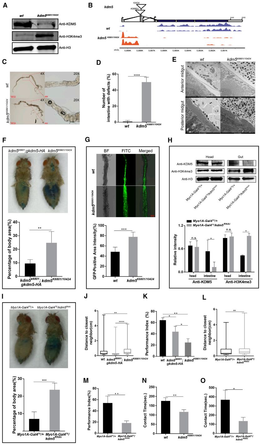 ?圖1. ?A:野生型(wt, w1118)和基因敲除型(kdm5K6801/10424)果蠅的KDM5, H3K4me3和組蛋白H3水平(Western blot);B:wt和kdm5K6801/10424果蠅腸道組織KDM5轉(zhuǎn)錄水平(RNA-seq);C:wt和kdm5K6801/10424果蠅消化道影像,紅框內(nèi)的斑點(diǎn)指示有腸道缺陷(氣泡);D:3-5齡wt和kdm5K6801/10424果蠅的腸道缺陷(氣泡)比例;E:透射電鏡觀察wt和kdm5K6801/10424果蠅前、后中腸上皮屏障;F:藍(lán)色食用染料標(biāo)記、測(cè)量wt和kdm5K6801/10424果蠅的腸滲透性;G:異硫氰酸熒光素(FITC)標(biāo)記的玻璃粉指示kdm5K6801/10424果蠅消化道滲透性較高;H:Myo1A-Gal4 TS/+和Myo1A-Gal4 TS/kdm5RNAi果蠅的頭、腸組織的KDM5, H3K4me3和組蛋白H3水平(Western blot);I:藍(lán)色食用染料標(biāo)記、測(cè)量Myo1A-Gal4TS/+和Myo1A-Gal4 TS/kdm5RNAi果蠅的腸滲透性;J、K和N:與wt果蠅相比,kdm5K6801/10424果蠅的接觸距離變遠(yuǎn)、交往活躍度下降、雌性社交接觸時(shí)間變短;L、M和O:與Myo1A-Gal4 TS果蠅相比,Myo1A-Gal4 TS/kdm5RNAi果蠅也發(fā)生了接觸距離變遠(yuǎn)、社交活躍度下降、雌性交往接觸時(shí)間變短。