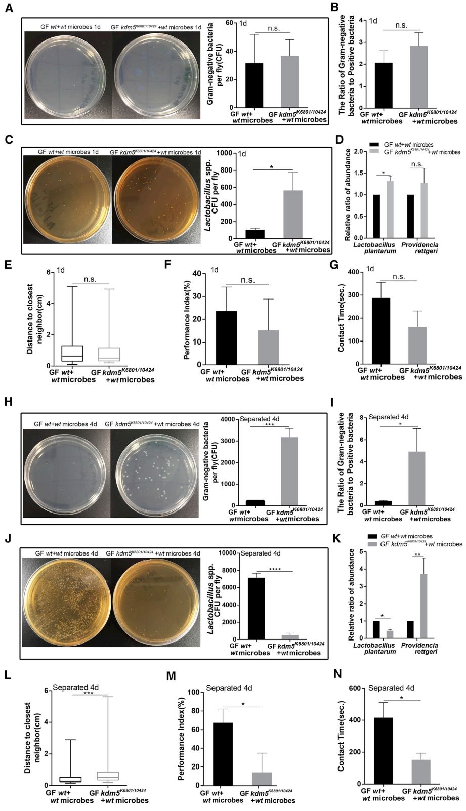?圖3. A-E:采用wt果蠅的菌群重塑后,1日齡無(wú)菌wt和kdm5K6801/10424果蠅的腸道革蘭氏陰性菌數(shù)量(CFU/只)、乳酸菌(Lactobacillus spp.)數(shù)量(CFU/只)、革蘭氏陰性菌與陽(yáng)性菌的比例、L. plantarum L168和P. rettgeri P6相對(duì)豐度(RT-PCR)、接觸距離、社交活躍度、雌性交往接觸時(shí)間比較;F-N:采用wt果蠅的菌群重塑后,4日齡無(wú)菌wt和kdm5K6801/10424果蠅的比較(同上述A-E)。