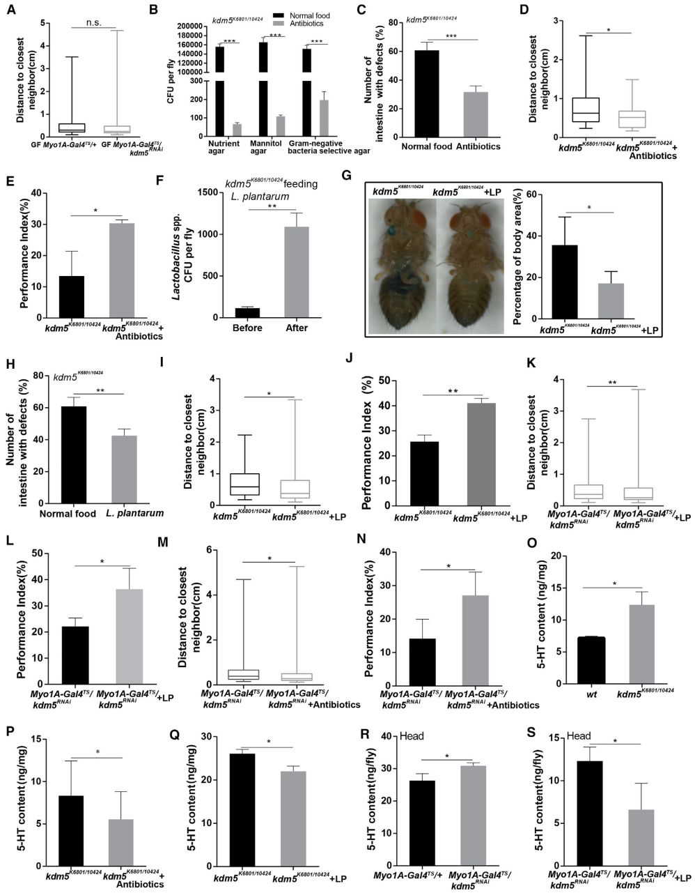 圖4. A:無(wú)菌Myo1A-Gal4 TS/+和Myo1A-Gal4 TS/kdm5RNAi果蠅的接觸距離比較;B:3種培養(yǎng)基(營(yíng)養(yǎng)物瓊脂、甘露糖瓊脂和革蘭氏陰性菌瓊脂)培養(yǎng)的標(biāo)準(zhǔn)日糧和抗生物添加日糧對(duì)kdm5K6801/10424果蠅腸道致病菌數(shù)量(CFU/只)的影響;C-E:標(biāo)準(zhǔn)日糧和植物乳桿菌對(duì)kdm5K6801/10424果蠅的腸道缺陷(氣泡)、接觸距離和社交活躍度的影響;F-J:標(biāo)準(zhǔn)日糧和植物乳桿菌(L. plantarum L168)添加日糧對(duì)kdm5K6801/10424果蠅的植物乳桿菌(L. plantarum L168plantarum L168Lactobacillus spp.)數(shù)量(CFU/只)、腸滲透性、腸道缺陷(氣泡)、接觸距離和社交活躍度的影響;K-L:標(biāo)準(zhǔn)日糧和乳酸菌(Lactobacillus spp.)添加日糧對(duì)Myo1A-Gal4 TS/kdm5RNAi果蠅的接觸距離和社交活躍度的影響;M-N:標(biāo)準(zhǔn)日糧和抗生素添加日糧對(duì)Myo1A-Gal4TS/kdm5RNAi果蠅的接觸距離和社交活躍度的影響;O-S:5-羥色氨(5-HT)分別在wt與kdm5K6801/10424果蠅、標(biāo)準(zhǔn)日糧與抗生物添加日糧飼養(yǎng)的kdm5K6801/10424果蠅、標(biāo)準(zhǔn)日糧與乳酸菌(Lactobacillus spp.)添加日糧飼養(yǎng)的kdm5K6801/10424果蠅、Myo1A-Gal4 TS/+與Myo1A-Gal4 TS/kdm5RNAi果蠅、標(biāo)準(zhǔn)日糧與乳酸菌(Lactobacillus spp.)添加日糧飼養(yǎng)的Myo1A-Gal4 TS/kdm5RNAi果蠅組間的濃度(ng/mg)比較。