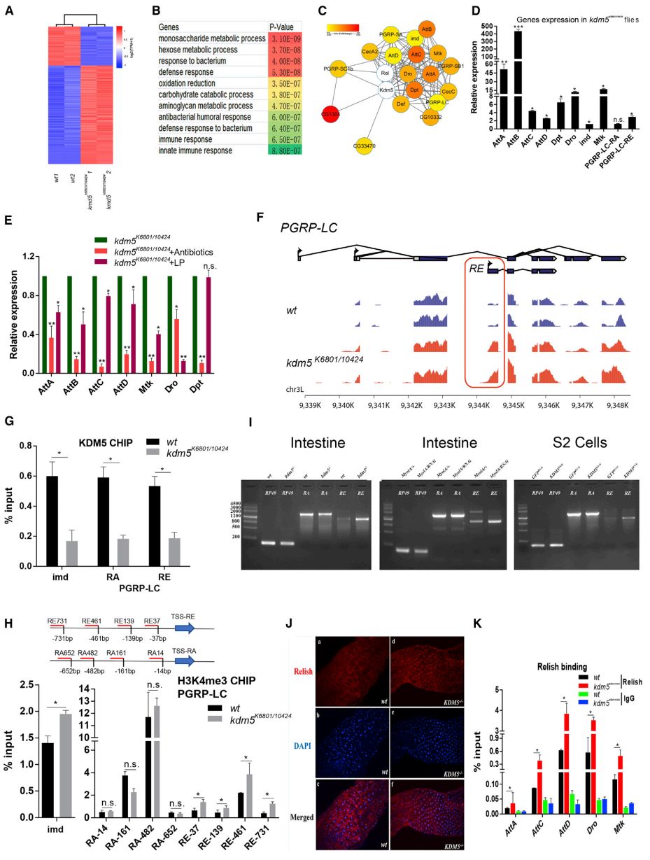 圖5. A-C:wt和kdm5K6801/10424果蠅腸道組織差異表達(dá)基因的分層聚類分析、GO富集分析和蛋白互作網(wǎng)絡(luò)分析;D:與wt果蠅相比,kdm5K6801/10424果蠅腸道組織的抗菌和先天免疫反應(yīng)基因相對(duì)表達(dá)(RT-PCR);E:與kdm5K6801/10424果蠅相比,飼喂植物乳桿菌(L. plantarum L168)和抗生素日糧的kdm5K6801/10424果蠅腸道組織的抗菌和先天免疫反應(yīng)基因相對(duì)表達(dá);F:wt和kdm5K6801/10424果蠅腸道組織的PGRP-LC基因結(jié)構(gòu)和轉(zhuǎn)錄模式;G-H:wt與kdm5K6801/10424果蠅腸道組織imd、PGRP-LC-RA、PGRP-LC-RE基因啟動(dòng)子區(qū)域的KDM5水平和H3K4me3水平分析(ChIp-qPCR);I:kdm5K6801/10424和Myo1A-Gal4 TS/kdm5RNAi果蠅腸道組織,以及S2細(xì)胞的全長(zhǎng)PGRP-LC-RA和PGRP-LC-RE表達(dá)分析(RT-PCR);J:wt和kdm5K6801/10424果蠅腸道組織的Relish免疫熒光染色;K:wt和kdm5K6801/10424果蠅腸道組織的Relish基因啟動(dòng)子區(qū)域的Relish水平分析(ChIp-qPCR)。