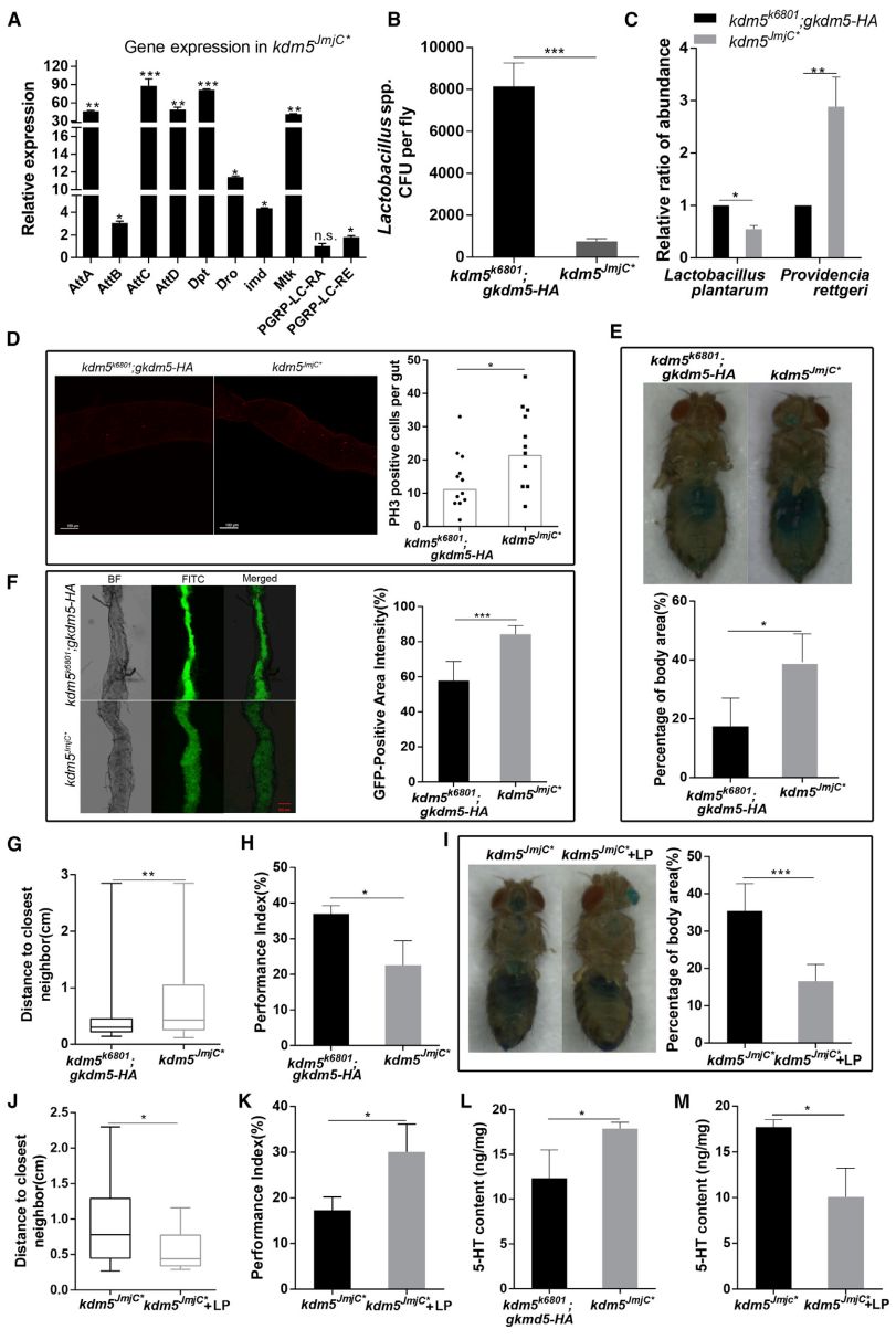 ?圖6. A:與kdm5k6801;gkdm5-HA果蠅相比,3-5日齡kdm5k6801;gkdm5JmjC*-HA(簡(jiǎn)稱kdm5Jmjc*)果蠅腸道組織的抗菌和先天免疫反應(yīng)基因的表達(dá)(RT-PCR);B-C:3-5日齡kdm5k6801;gkdm5-HA和kdm5Jmjc*果蠅腸道的乳酸菌(Lactobacillus spp)、植物乳桿菌(L. plantarum L168)、P. rettgeri P6數(shù)量(CFU/只);D:3-5日齡kdm5k6801;gkdm5-HA和kdm5Jmjc*果蠅中腸PH3正染色干細(xì)胞數(shù)目;E:3-5日齡kdm5k6801;gkdm5-HA和果蠅腸滲透性評(píng)估;F:異硫氰酸熒光素(FITC)標(biāo)記的玻璃粉指示kdm5Jmjc*果蠅消化道滲透性較高;G-H:kdm5k6801;gkdm5-HA與kdm5Jmjc*果蠅的接觸距離和交往活躍度比較;I-K:標(biāo)準(zhǔn)日糧與植物乳桿菌(L. plantarum L168)添加日糧對(duì)kdm5Jmjc*果蠅消化道滲透性、接觸距離和交往活躍度的比較;L:kdm5k6801;gkdm5-HA和kdm5Jmjc*果蠅腹部組織的5-羥色胺(5-HT)濃度比較;M:標(biāo)準(zhǔn)日糧與植物乳桿菌(L. plantarum L168)添加日糧對(duì)kdm5Jmjc*果蠅5-HT濃度的影響。