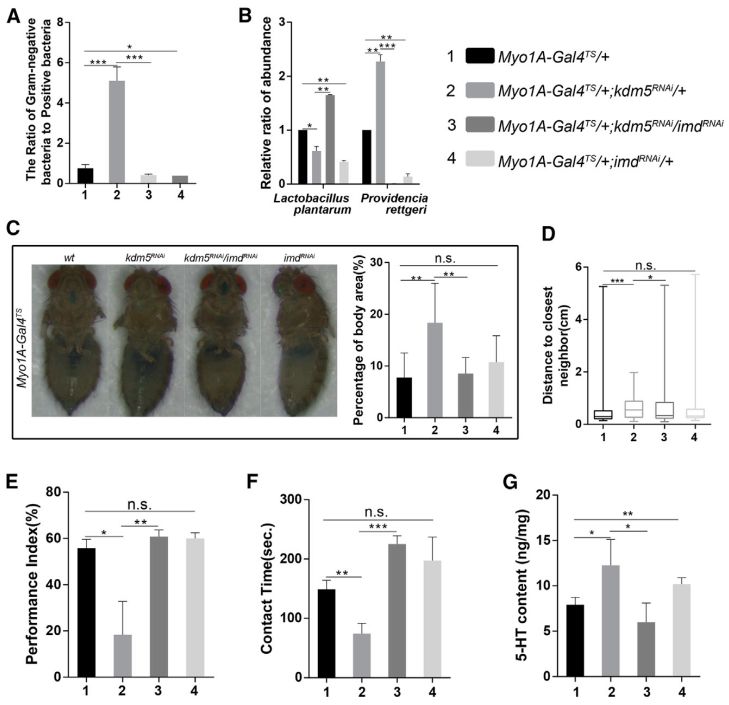 圖7. A:四組(Myo1A-Gal4TS/+、Myo1A-Gal4TS/+; kdm5RNAi/+、Myo1A-Gal4TS/+; kdm5RNAi/ imdRNAi和Myo1A-Gal4TS+; imdRNA/+)果蠅的腸道革蘭氏陰性菌與陽(yáng)性菌的比例;B:四組(如圖A)果蠅的腸道L. plantarum L168和P. rettgeri P6相對(duì)豐度;C:四組果蠅的腸滲透性、接觸距離、交往活躍度、交往接觸時(shí)間、5-羥色胺(5-HT)濃度比較。