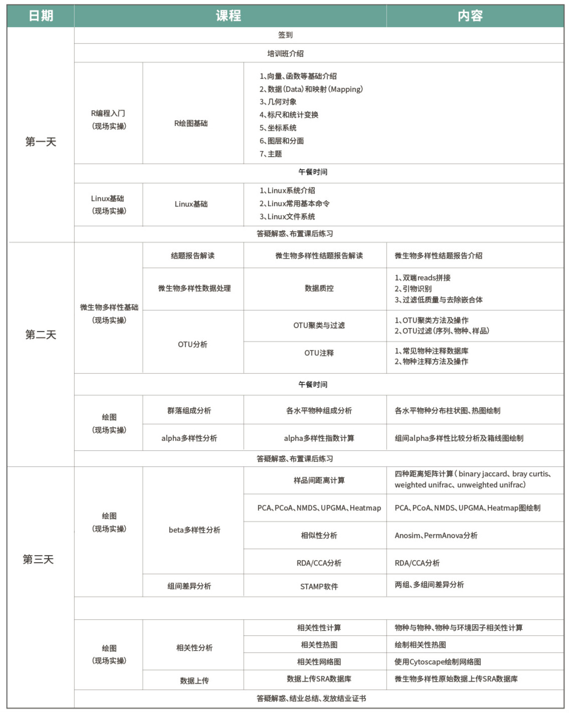 本次課程通過采用理論和實(shí)踐緊密結(jié)合的教學(xué)形式,以理論基礎(chǔ)至數(shù)據(jù)挖掘?qū)訉舆f進(jìn)的方式,讓大家在短時(shí)間內(nèi)對(duì)微生物研究中涉及的知識(shí)和方法得到迅速提升。同時(shí),在3天課程中,我們現(xiàn)場(chǎng)會(huì)有講師與助教與大家面對(duì)面的咨詢探討在研究思路、以及分析方面等遇到的問題,從而在多元思維中幫助大家開拓思路,挖掘微生物更多的價(jià)值。