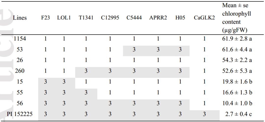 為進(jìn)一步精細(xì)定位pc1,本研究對(duì)624個(gè)F2(1154 × NIL 86-45)單株標(biāo)記分型以篩選QTL區(qū)域內(nèi)的交換單株?;谇捌谘芯?,標(biāo)記T1341與QTL peak連鎖最為緊密 (Brand et al., 2012),作者又在T1341附近開發(fā)出6個(gè)標(biāo)記,在標(biāo)記F23與H05間,共篩選出34個(gè)F4交換單株,可代表6種基因型組合,橫跨Chr.1:5cM的區(qū)間。為排除pc1與pc10互作的影響,作者將所有交換單株的CaGLK2固定為1154等位基因。結(jié)果分析暗示,F(xiàn)23與LOL1是與QTL連鎖最為緊密的標(biāo)記,因?yàn)閘ine 15含PI 152225最短的導(dǎo)入片段且葉綠素含量顯著低于1154,而line 260在這2個(gè)標(biāo)記間含1154等位且與1154葉綠素含量沒有顯著性差異。此外,lines 53與260在APRR2-like位點(diǎn)含有PI 152225等位,葉綠素含量卻與1154沒有顯著差異,暗示此基因(APRR2)在本研究中的遺傳背景下不影響葉綠素含量(表1.)。
