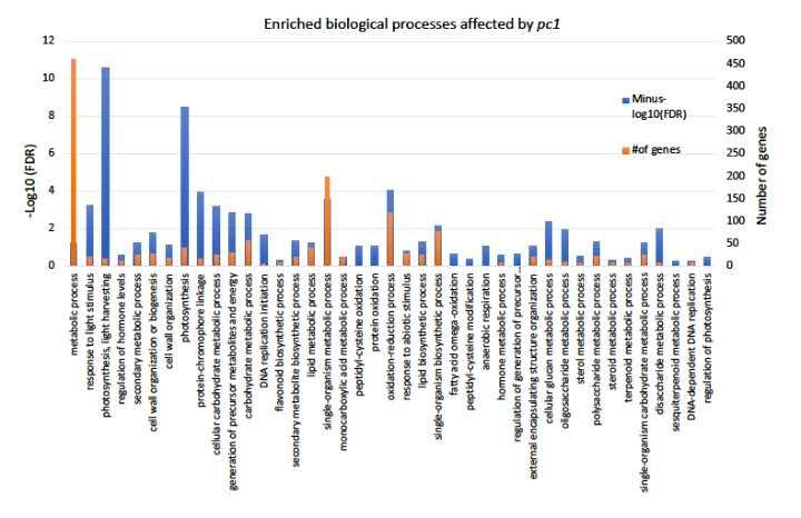 為研究pc1參與影響的細(xì)胞學(xué)過程,本研究對(duì)混池間983個(gè)差異表達(dá)基因進(jìn)行GO富集分析并根據(jù)生物過程進(jìn)行分類(圖5)。最顯著的GO term過程與光合作用及氧化還原有關(guān),這兩個(gè)過程包含184個(gè)DEGs,被分成17個(gè)亞類,其中最大的一類是氧化還原過程。這一類基因與葉綠素合成下調(diào)有關(guān),例如,POR,CAO與HEMA1,還與葉綠素降解基因上調(diào)有關(guān),例如,CA00g73130,暗示葉綠素合成與降解受這個(gè)QTL調(diào)控。另一類重要基因,包含Chlorophyll a/b-結(jié)合蛋白的多個(gè)成員基因(CA01g17090,CA02g12050,CA02g12060,CA02g12070等),在淡綠混池中下調(diào)表達(dá),它們參與光合、蛋白發(fā)色團(tuán)及光刺激響應(yīng)等過程。另外,若干與碳固定有關(guān)的Rbc家族基因在淡綠混池中也呈現(xiàn)下調(diào)表達(dá)。