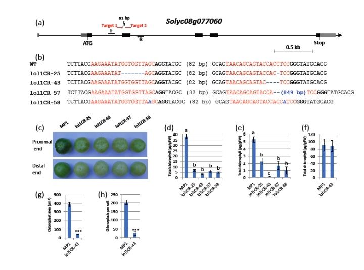 為證明CcLOL1參與調(diào)控葉綠體發(fā)育與葉綠素含量,本研究利用CRISPR/Cas9技術(shù)敲除番茄栽培種MP1中的辣椒同源基因Solyc08g077060(SlLOL1)獲得突變體。首先設(shè)計(jì)兩個(gè)gRNAs靶定exon 2,兩者相距91 bp;然后遺傳轉(zhuǎn)化番茄MP1,經(jīng)陽(yáng)性苗篩選,檢測(cè),最終獲得4類突變體lol1CR-25,lol1CR-43,lol1CR-57與lol1CR-58,或缺失,或插入,經(jīng)T1與T2代測(cè)序驗(yàn)證獲得純合突變體(圖 6.a,b)。