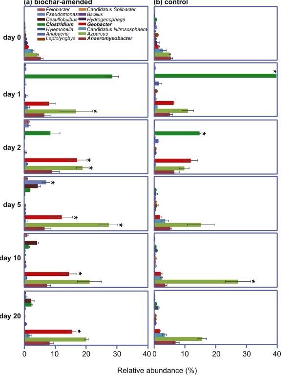 在生物炭修正組中,地桿菌(geobacter)相對轉(zhuǎn)錄豐度顯著高于對照組(無生物炭修正組)(圖4a),表明生物炭顯著提高了水稻土壤中地桿菌(geobacter)的轉(zhuǎn)錄活性。此外,生物炭對孵育初期的厭氧粘細菌(Anaeromyxobacter)和希瓦氏菌(Shewanella)的轉(zhuǎn)錄也有積極影響,然而抑制了對菌(clostridium)的轉(zhuǎn)錄水平(圖4b-d)。