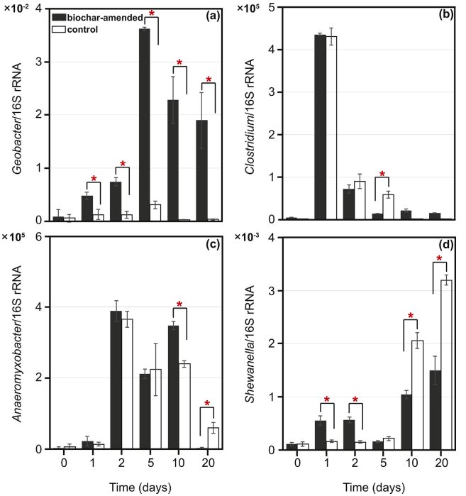 圖4. 生物炭修正與無生物炭修正的水稻土壤的(a):地桿菌(geobacter);(b)梭菌(clostridium);(c)厭氧粘細菌(Anaeromyxobacter)和(d)希瓦氏菌(Shewanella)的相對轉(zhuǎn)錄豐度。