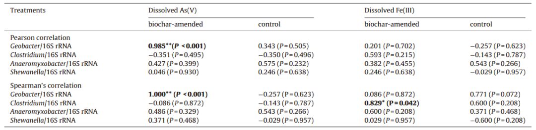 表1. 地桿菌(Geobacter)、?梭菌(Clostridium)、厭氧粘細菌(Anaeromyxobacter)和希瓦氏菌(Shewanella)的相對轉(zhuǎn)錄水平與釋放砷As(V)和鐵Fe(III)的Pearson和Speraman相關(guān)性檢驗.