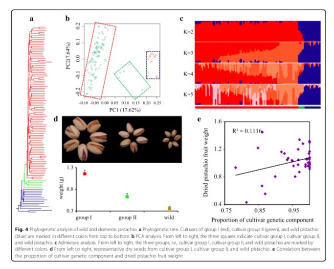 基于重測(cè)序數(shù)據(jù),研究人員推測(cè)了這些物種的有效群體大小的變化,并發(fā)現(xiàn)在 Pleistocene期間發(fā)生了瓶頸事件,且在 ~200 kyr前,有效群體大小增加。系統(tǒng)發(fā)育樹顯示馴化和野生開(kāi)心果之間的分離(圖4a)。利用δaδi推算野生和馴化開(kāi)心果的分化時(shí)間在 ~8000年前,這與早在公元前6750年就表明開(kāi)心果種子是一種常見(jiàn)的食物這一考古記錄相似。為了深入了解開(kāi)心果種質(zhì)之間的遺傳關(guān)系,研究人員進(jìn)行了兩項(xiàng)經(jīng)典分析:群體結(jié)構(gòu)和主成分分析(圖4b,c)。這些分析清晰的顯示栽培種質(zhì)分為兩個(gè)群。栽培種Group I的LD最高,栽培種Group II和野生開(kāi)心果的LD衰減值相近。Group II包括 Qazvini,Italiaei和Badami