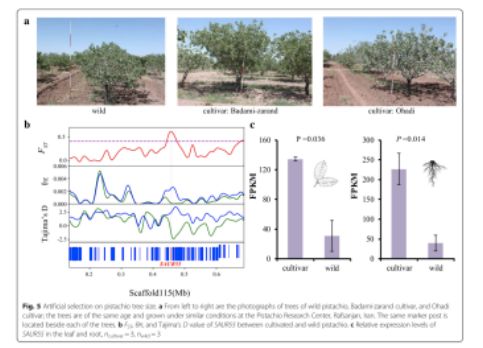 在本研究中,為了更好地了解開(kāi)心果馴化的分子進(jìn)化歷史,研究人員組裝了開(kāi)心果的基因組草圖,并對(duì)107個(gè)全基因組進(jìn)行了重測(cè)序,包括93個(gè)馴化和14個(gè)野生的開(kāi)心果以及35個(gè)不同野生黃連木屬物種。整合基因組和轉(zhuǎn)錄組學(xué)分析顯示,擴(kuò)張的基因家族(如細(xì)胞色素P450和幾丁質(zhì)酶)和茉莉酸(JA)生物合成途徑可能參與應(yīng)激適應(yīng)。比較群體基因組分析顯示,開(kāi)心果大約在8000年前被馴化,馴化的關(guān)鍵基因可能是那些涉及樹木和種子大小的基因,這些基因經(jīng)歷了人工選擇。這些基因組序列應(yīng)該有助于未來(lái)的研究,以了解沙漠作物的農(nóng)業(yè)和環(huán)境相關(guān)特性的遺傳基礎(chǔ)。