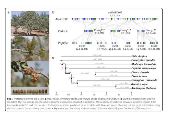 2019年04月18日,Genome Biology在線發(fā)表了中國(guó)科學(xué)院昆明動(dòng)物研究所與北京百邁客生物科技有限公司共同合作文章“Whole genomes and transcriptomes reveal adaptation and domestication of pistachio” 中國(guó)科學(xué)院昆明動(dòng)物研究所研究員吳東東為本文通訊作者,中國(guó)科學(xué)院昆明動(dòng)物研究所曾琳,北京百邁客公司大項(xiàng)目負(fù)責(zé)人韓鳳鳴,戴鶴為共同第一作者。本文繪制了開(kāi)心果的基因組草圖,并對(duì)其進(jìn)行了大規(guī)模的基因組重測(cè)序并進(jìn)行了比較基因組分析,表明,開(kāi)心果的應(yīng)激適應(yīng)可能與細(xì)胞色素P450和幾丁質(zhì)酶基因家族的擴(kuò)增有關(guān)。尤其重要的是,比較轉(zhuǎn)錄組學(xué)分析表明茉莉酸(JA)生物合成途徑在開(kāi)心果耐鹽性中起著重要作用。此外,研究人員對(duì)93個(gè)栽培種和14個(gè)野生種(P. vera)基因組及35個(gè)親緣關(guān)系密切的野生黃連木屬基因組進(jìn)行了重測(cè)序,以提供對(duì)種群結(jié)構(gòu)、遺傳多樣性和馴化的見(jiàn)解與思路。