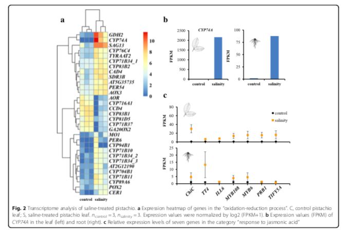 進(jìn)一步研究開(kāi)心果的耐鹽性潛在遺傳機(jī)制,研究者進(jìn)行了鹽度實(shí)驗(yàn)。開(kāi)心果砧木(P.vera?L.cv.Ohadi)的葉和根在正常條件和鹽度條件下進(jìn)行RNA測(cè)序。使用Tophat-Cufflinks-Cuffdiff?pipeline,在鹽水條件下處理的植物與對(duì)照之間表現(xiàn)出差異表達(dá),鑒定214和461蛋白質(zhì)編碼基因分別在葉和根組織中(ncontrol = 3, nsalinity = 3, corrected P < 0.05,)?;蚋患治霭l(fā)現(xiàn)許多差異表達(dá)基因(31個(gè)基因)參與到“氧化還原進(jìn)程”中(圖2a,b)。像比較基因組分析一樣,該類別中的15個(gè)基因是細(xì)胞色素P450基因,特別是CYP74A(即AOS),其編碼細(xì)胞色素P450 CYP74基因家族的一個(gè)成員,其起到丙二烯氧化物合酶(AOS)的作用。這種酶催化茉莉酸酯合成中的第一步[即茉莉酸(JA)]。AOS中每千堿基外顯子的表達(dá)片段(FPKM)值在葉片中從對(duì)照中的近0增加到鹽水條件下的2163.75,在根中從對(duì)照中的1.87增加到鹽水處理的87.74。研究者還發(fā)現(xiàn)了7個(gè)差異表達(dá)的基因(ChiC, TT4, ILL6, MYB108, MYB6, PRB1, and TIFY5A)被富集到“茉莉酸反應(yīng)”中。以前的研究表明,干旱和高鹽度導(dǎo)致水稻葉片和根部JA含量增加。鹽度處理可以增加濕地物種鳶尾(Iris hexagona)中的內(nèi)源JA水平。茉莉酸酯激活植物對(duì)生物脅迫(即病原體攻擊)和非生物脅迫(即鹽)的反應(yīng)。在此,用鹽水處理增加了在葉和根中參與茉莉酸反應(yīng)的這些基因的表達(dá)水平(圖2c)。這些基因的表達(dá)增加(例如,AOS作為酶催化茉莉酸酯合成中的第一步)應(yīng)該增加茉莉酮酸酯的合成,因此,它們很可能被開(kāi)心果用于應(yīng)對(duì)鹽脅迫。