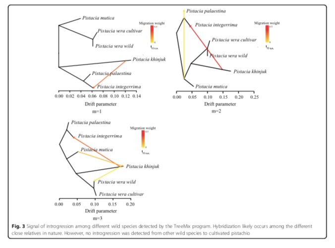 為了研究開(kāi)心果的種群歷史和適應(yīng)性進(jìn)化,研究者對(duì)107個(gè)開(kāi)心果基因組進(jìn)行重測(cè)序,包括93個(gè)品種和14個(gè)野生開(kāi)心果,平均測(cè)序深度為6-8X。作者還重新測(cè)序了來(lái)自不同近緣種的35個(gè)基因組,包括P.mutica,P.khinjuk,P.integerrima和P. palaestina。用stringent GATK pipeline,發(fā)現(xiàn)14.77百萬(wàn)個(gè)單基因變異位點(diǎn),其中2.42百萬(wàn)個(gè)在基因區(qū)。使用鄰近法和最大似然法的系統(tǒng)發(fā)育分析清楚地分離了5種不同的種群,即?P.vera, P.mutica, P. khinjuk, P. integerrima, and P. palaestina。通過(guò)TreeMix程序在一些物種之間檢測(cè)到漸滲的信號(hào),這表明雜交可能在自然界中的不同近親之間發(fā)生,并且與植物中被發(fā)現(xiàn)的普遍雜交一致。然而,從其他開(kāi)心果物種到馴化的開(kāi)心果沒(méi)有檢測(cè)到漸滲,這種現(xiàn)象來(lái)源于野生的P. vera(圖3)。