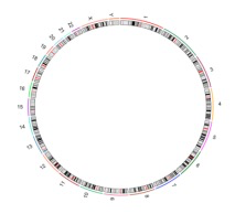 #?指定內(nèi)容在內(nèi)側(cè)的環(huán)形還是外側(cè)的環(huán)形生成 side?<-?"in";#?指定內(nèi)容在第幾個環(huán)形生成 track.num?<-?1;#?繪圖 RCircos.Gene.Connector.Plot(RCircos.Gene.Label.Data,?track.num,?side); #?在染色體上添加基因名稱,?指定內(nèi)容在第幾個環(huán)形生成 name.col?<-?4;#?指定基因名在數(shù)據(jù)的第幾列 track.num?<-?2;#?繪圖 RCircos.Gene.Name.Plot(RCircos.Gene.Label.Data,?name.col,track.num,?side);