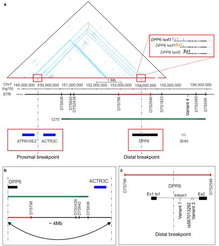 作者設(shè)計(jì)引物擴(kuò)增連鎖區(qū)域去證實(shí)這些變異,結(jié)果發(fā)現(xiàn)PCR產(chǎn)物在兩個(gè)7號染色體的位點(diǎn)比對到了相反的方向,且距離將近4Mb。7號染色體上的局部比對,證實(shí)了反向雜合低拷貝重復(fù)的出現(xiàn)。遠(yuǎn)端的斷點(diǎn)位于7q36.2連鎖區(qū)域上,DPP6基因的1號內(nèi)含子上,被預(yù)測改變了基因的編碼序列;臨近的倒位斷點(diǎn)位于連鎖區(qū)域之外。
