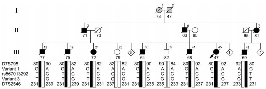 對1270家族的第三代4個(gè)患病的兄弟姐妹(III-12,III-38,III-41,III-48)進(jìn)行WGS測序。選擇4個(gè)患者共有的注釋的高質(zhì)量的遺傳變異,罕見的(千人基因組計(jì)劃中<1%)或者雜合的非編碼變異進(jìn)行后續(xù)研究。在STR標(biāo)記D7S636和D7S559上連鎖區(qū)域的位點(diǎn)保留了79個(gè)非編碼的變異。驗(yàn)證和分離分析保留了38個(gè)非編碼變異,這些變異在1270家族的疾病單倍型中共分離。對照個(gè)體中的變異的基因型顯示4個(gè)變異對于1270家族是唯一的。其中3個(gè)變異均位于DPP6基因的1號內(nèi)含子上,另一個(gè)變異位于基因間區(qū)(距SHH基因最近,27.3Kb)距離DPP6基因下游908kb。而這四個(gè)變異在ENCODE注釋都不具有潛在的高度破壞性。