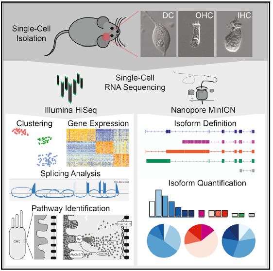 2、SmartSeq2單細(xì)胞擴(kuò)增,IHC?(n?=?42),?OHC?(n?=?127),?and?DC?(n?=?39)進(jìn)行二代Illumina平臺(tái)轉(zhuǎn)錄組測序;12個(gè)p15小鼠OHCs進(jìn)行ONT全長轉(zhuǎn)錄組測序。