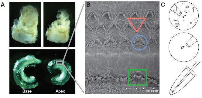 與哺乳動(dòng)物耳蝸中的各種支持細(xì)胞類型相比,聽覺HC的豐度較低。為了估計(jì)小鼠耳蝸膜迷路中可用于單細(xì)胞分離的HC數(shù)量,據(jù)報(bào)道在成熟的小鼠耳蝸中約765個(gè)IHCs,通過對(duì)小鼠顳骨中心切片,細(xì)胞核計(jì)數(shù),估計(jì)小鼠膜性迷路中的細(xì)胞數(shù)為415,395,其中IHC和OHC比例僅為0.19%和0.59%。