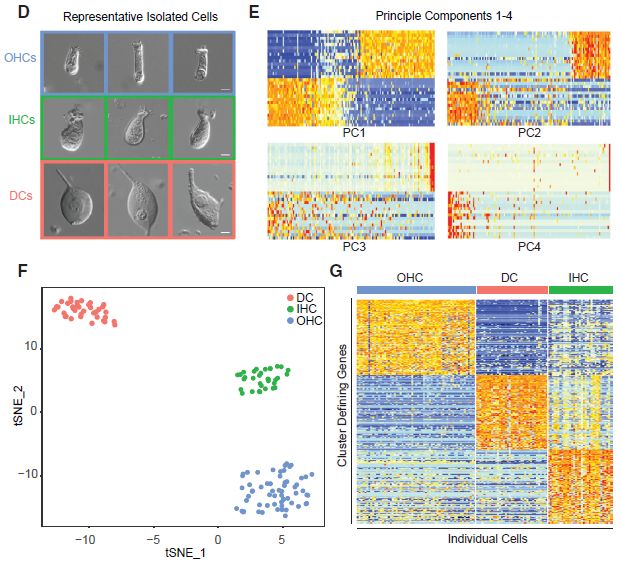 使用Seurat進(jìn)行基于主成分1和2的無偏差聚類(圖1E)。得到的tSNE?clusters顯示IHC、OHC和DC分離明顯,形成與其形態(tài)學(xué)分組一致的無偏細(xì)胞特異性組(圖1F)。為了鑒定每種細(xì)胞類型的特征性表達(dá)模式,在AUC分類器下為每種細(xì)胞類型提取了前100個(gè)cluster定義基因(圖1G)。