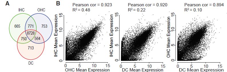為了比較細(xì)胞類型之間表達(dá)譜,計(jì)算各cluster內(nèi)所有細(xì)胞中每個(gè)基因平均表達(dá)水平。通過維恩圖對(duì)平均表達(dá)譜比較,每種細(xì)胞類型約表達(dá)700個(gè)特異基因(OHC-753;?IHC-655;?DC-713;歸一化后counts>10)。且發(fā)現(xiàn)IHCs和DC具有高比例重疊(共享750個(gè)基因,與OHC和DC共享564個(gè)基因相比),但是IHC和OHC共享771個(gè)基因表達(dá)(圖2A)。為了更嚴(yán)格地測試每種細(xì)胞類型的轉(zhuǎn)錄相似性,使用所有基因進(jìn)行Pearson相關(guān)和R2回歸分析?;貧w分析,所有3組間比較中發(fā)現(xiàn)了強(qiáng)相關(guān)性,OHCs和IHC之間的相關(guān)性最高,OHCs和DC之間的相關(guān)性最低。OHC和DC表達(dá)譜最不相似可能反映了OHC高水平特化(圖2B)。